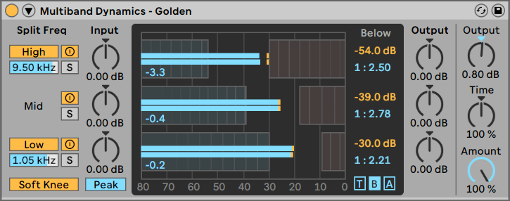 You can helpfully set the knee for each band individually, which can be visualized as the threshold “digging even deeper” to react to quieter-level audio. Lowering a threshold vs increasing a knee will both push the total amount of compression further, but in different ways.
