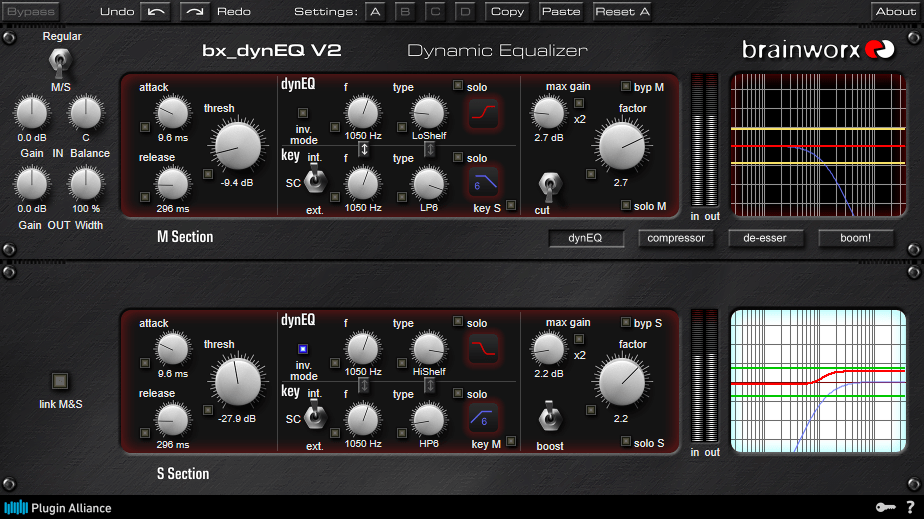 bx_dynEQ is deceptively versatile, allowing pretty much any implementation of dynamic reactivity you can imagine (if you can figure out the somewhat awkward GUI, that is). It’s main limitation is that it’s only one band (two if you’re in M-S mode)… however, nothing is stopping you from using multiple instances of the plugin for as many bands as you need. It’ll also come in handy when using a different processor and you need “just one more” band of dynamic EQ.