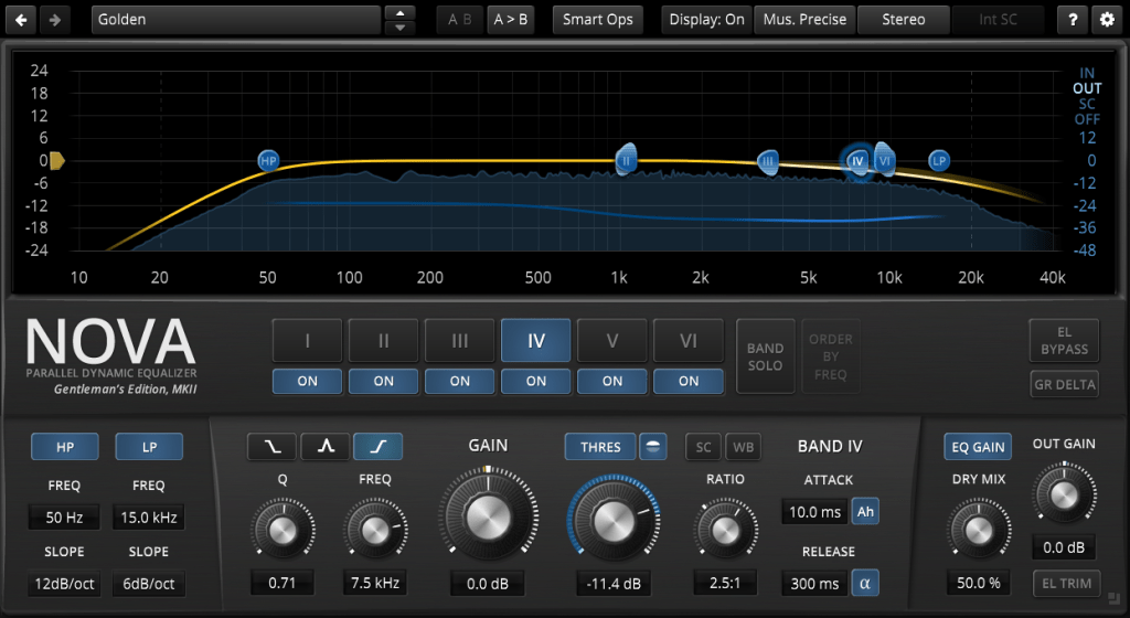 Both editions of TDR’s Nova are supremely versatile, with top-quality sound. Bands have individual attack and release times and can react to their own slice or a chosen target frequency. You can set each band to be a bell, low shelf, or high shelf. The detection for each band can be set to a different frequency and Q than its process (though the filter type must be the same, so in this regard it’s not quite as versatile as bx_dynEQ).