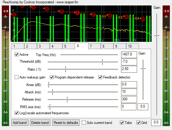 The standout feature of ReaXComp is the fact that you can freely add any number of bands. It has a lot of per-band parameters to tweak. Want to set up a custom seventeen-band multiband compressor, each band with different threshold, ratio, knee, attack, release, and rms sizes as well as auto-release, feedback detection, and log-scale options? Well, here ya go.