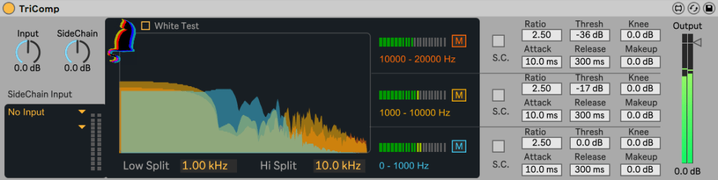 TriComp is interesting because i really haven’t seen that many compressor plugins made with Max for Live. Based on listening as well as analysis with CompScope, to me it has a nice VCA sort of character, for a direct and reliable ability to acquire anticipated results from the shown parameter values.
