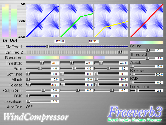 WindCompressor is a straightforward multiband compressor, with the full complement of parameters to sculpt the sound as desired, including adjustable overall RMS and Lookahead. It appears that the cutoff between the mids and highs is steeper than the one between the lows and mids, which is interesting. It also includes an output limiter which can be handy.