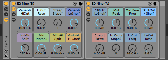 This is meant as more of a fully-featured tone-shaper than EQ Seven quite amounts to. Since Live Intro doesn’t have access to EQ Eight, providing the ability to tweak as many frequencies as possible — as easily as possible — in that version of the DAW seemed a worthwhile endeavor. Sixteen macro controls in total are provided, split across two sections. Section B is first, followed by Section A. While as surgical as is manageable, I’d still think of it more as an “analog EQ” than as a “clean parametric digital EQ”, since it’s not flat at default settings and is somewhat quirky.
