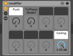 It’s so dumb, it’s brilliant. Slowly turn up Push until things start to sound definitely a little fuzzy. Reduce the Push dial a little (maybe by 5 or 10). Now, turn up Tuffness Mode until at some point suddenly it becomes very obviously too fuzzy. Lower the value by about 20 from there (to back down one mode). Finally, reduce Push another slight touch, just to take the edge off. You should now be left with a tasty degree of loudness at this point, threatening the boundary of what is considered polite.