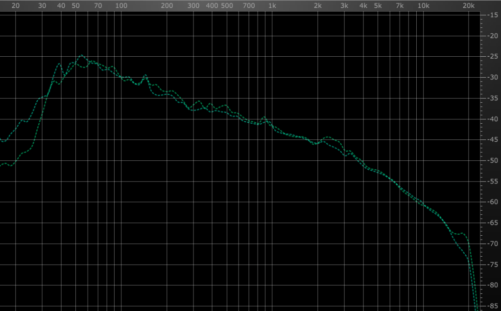 The Thud Shelf: Modern mixing approaches are dang cutting-edge nowadays and can figure out clever ways to stuff tons of low end into mixes, cleanly. This can manifest as a “block plateau” of low end average peaks that stretch from the lowest fundamental up to just below the mud zone. This technique pretty much guarantees that a track will sound fat, thick, and punchy on any set of speakers. It’s admittedly effective, but does move the contour away from a direct pink noise slope.