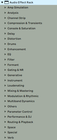 The “Analysis” category is added, and it is much welcomed. “Distortion” has keywords added so that degradation effects show up there. Various effects previously crammed within “Mixing & Mastering” have been granted their own categories… I’ve added a “Compression & Transients” category to align with the Elemental Mixing Template. “Gating & NR” category for dynamics-increasing and noise reduction effects. “Console & Saturation” has been added as a category, since i tend to use those for different purposes than more overt distortions. “Delay” (previously placed inside “Modulation & Rhythmic”) now has a dedicated category. “Enhancement” category added for exciters and other special-purpose, hard-to-categorize processors. “EQ” now has its own category apart from “Filter”. “Generative” category added for audio effects that generate sound. “Channel Strip” category added for multi-effect chain plugins. “Loudenating” category (shoutout to chris from airwindows for that term) added for limiters, maximizers… things whose purpose and result is to make stuff louder. “Multiband Dynamics” category added, because those beasts are unique and special-purpose enough to have their own demesnes. “Parameter Control” category because all those MaxForLive gadgets are so damn nifty to have on-hand in an accessible fashion. “Routing and Playback” for all the odd toys that do strange things with channel routing, signal sending, and et cetera. “Verb” because why the heck is there not a reverb category to begin with? They used to live in “Space”, which now i can designate only for things to do with stereo panning, perceived positionality, phase, and depth of field. “Drums” and “Instrument” still exist as effect categories, and are used for instrument-specific plugins (examples: eddie kramer DR, bass professor).