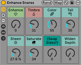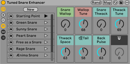 Each of the Tuned Drum Enhancer racks includes some macro variations that are mimicking the tonal focus points of choice drummers in select songs. As one quick example, you might move your snare sound more closely towards the tasty low-end thump of Al Jackson’s snare from Al Green’s timeless piece Let’s Stay Together.
